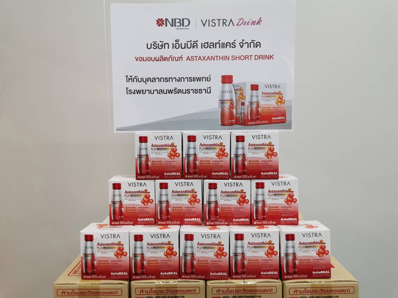บริษัท เอ็นบีดี เฮลท์แคร์ จำกัด ผู้จำหน่ายผลิตภัณฑ์แบรนด์วิสทร้า ได้มอบผลิตภัณฑ์ Astaxanthin shot drink จำนวน 3,000 ขวด ให้กับบุคลากรทางการแพทย์ โรงพยาบาลนพรัตน์ราชธานี เพื่อเป็นกำลังใจให้กับบุคลากรทางการแพทย์และเจ้าหน้าที่ด้านสาธารณสุขทุกภาคส่วนที่ต้องปฎิบัติหน้าที่อย่างหนักหน่วงในขณะนี้